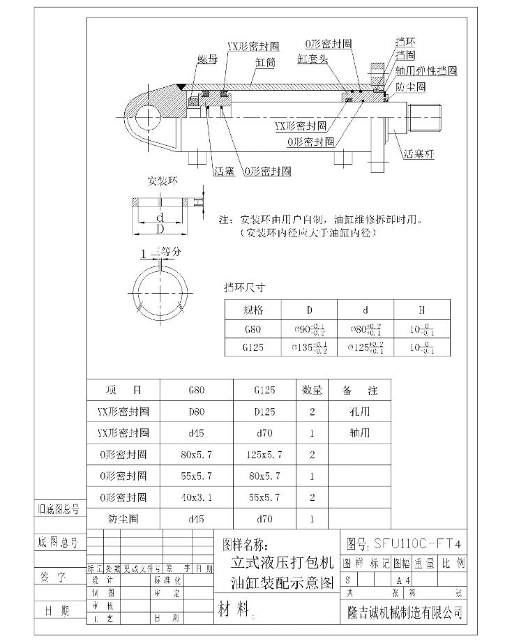六 在外換好YX型軸用油封d70,O型密封圈Φ125x5.7=2件,Φ80x5.7(注意YX型d70油封不能裝反)