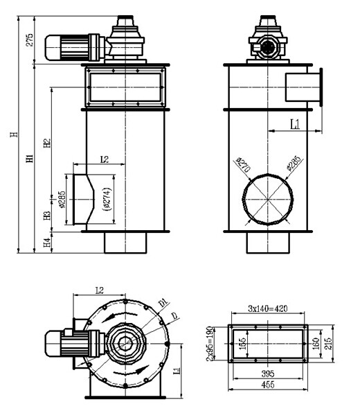 The trial run: First of all, check and ensure that all circuits are in good condition and all components have no damage. Then turn on the power source. Put (SB3) in manual position. Spiral blade of the separator revolves at the anti-clockwise direction (see attached chart). Press (SB5), spiral blade of the separator revolves at the opposite direction. Otherwise, exchange any two among the three phase lines of the electric motor. If in the manual condition, the fan will be out of work. Turn (SB3) in the manual position and press (SB2), the separator and fan will be launched simultaneously and start to work. Attention: The revolving direction of the fan should be correct.